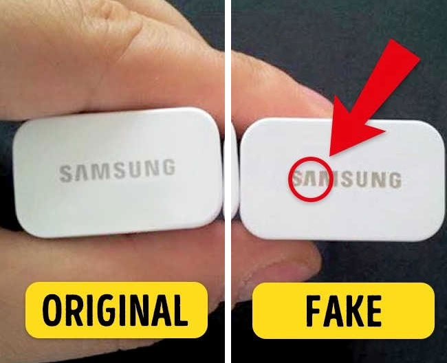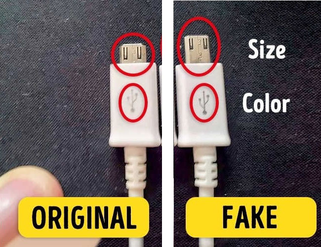 Khi mua, bạn cần chú ý về kích thước và màu sắc đặc trưng dây cáp của thương hiệu bạn đang dùng. Trừ khi các hãng có thông báo chính thức, còn lại họ sẽ không có bất kỳ thay đổi nào về kiểu dáng và thiết kế của dây cáp đi kèm sản phẩm. Ngoài ra, cảm giác dây cáp cắm vào sẽ rất chắc chắn và đồng đều, trong khi hàng giả bạn sẽ thấy các góc không chính xác và các bộ phận rời.