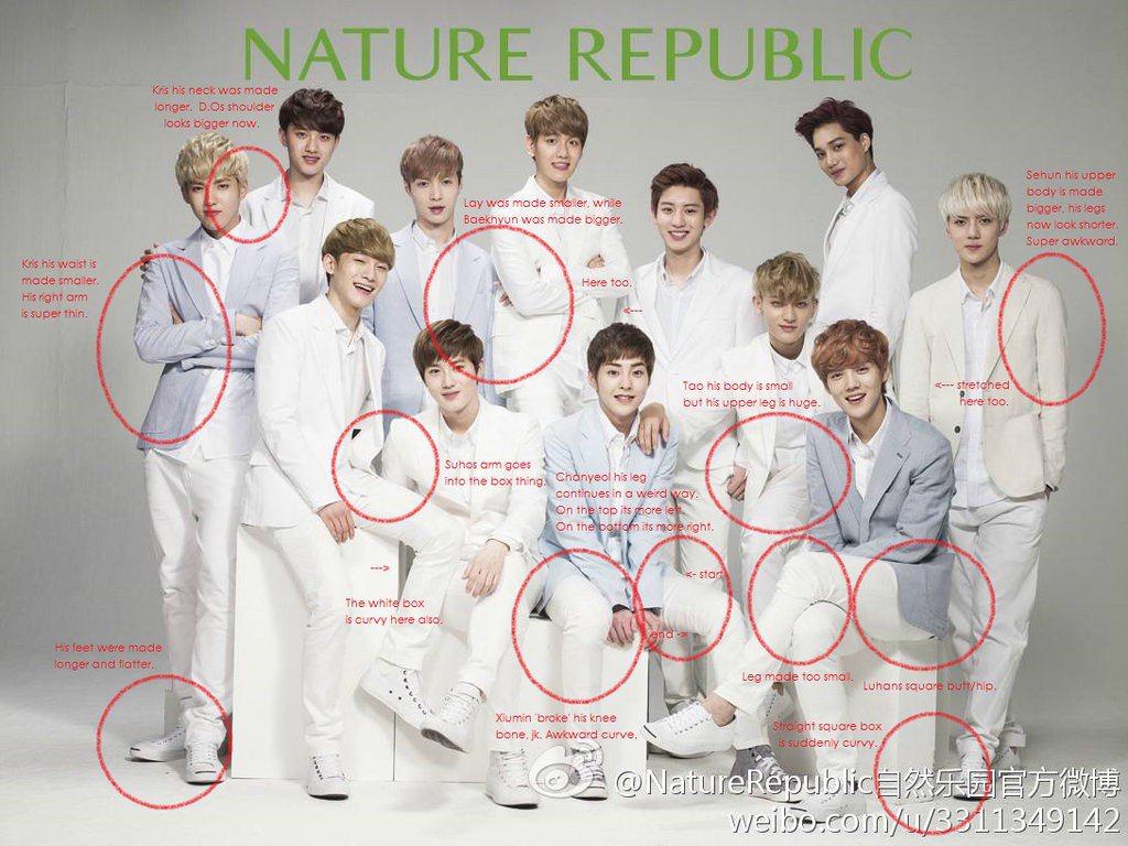 Jaekyung và Hyunyoung (Rainbow): Hình ảnh này từng bị chỉ trích bởi nó “tô vẽ” lên hình ảnh khiến người xem cảm thấy mình quá béo (hai nhân vật chính trong hình quá gầy). Phần ngực của nhân vật trong hình ảnh này dường như được chỉnh tăng kích thước trong khi đó bụng lại được bóp vào.