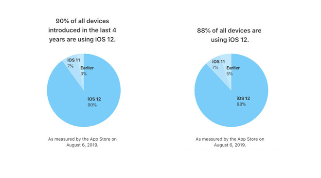 Apple nói 90% các thiết bị được hãng này giới thiệu trong 4 năm gần nhất hiện đã được cập nhật lên hệ điều hành iOS 12. 10% còn lại được chia cho iOS 11 (tỉ trọng 7%) và các phiên bản cũ hơn (tỉ trọng 3%). Cũng theo Apple, iOS 12 hiện đã được cài đặt trên 88% số lượng thiết bị hỗ trợ hệ điều hành này. Tương tự các phiên bản iOS trước đó, iOS 12 cũng có tốc độ được người dùng đón nhận khá nhanh chóng.