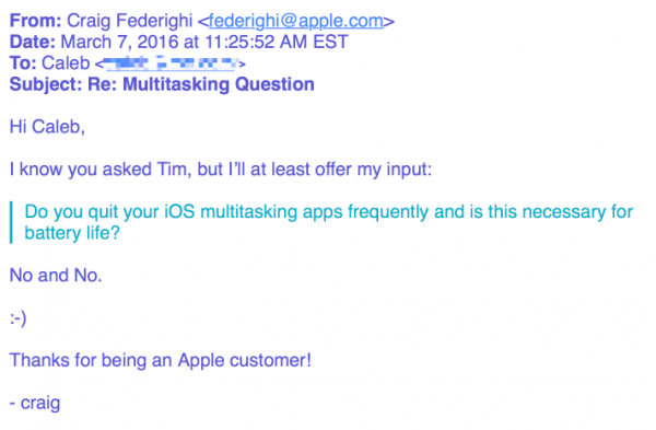10 người dùng iPhone thì có 9 người nghĩ rằng việc thoát hẳn các ứng dụng ở màn hình đa nhiệm app switcher (gọi là force close) có thể giúp cải thiện thời lượng pin và thậm chí tăng tốc chiếc điện thoại của bạn. Tuy nhiên, thực tế thì đây là một thói quen hoàn toàn không cần thiết, khi bạn hiểu cơ chế hoạt động của iOS. Một người dùng được cho là đã từng gửi email tới Tim Cook để hỏi xem ông có thoát tất cả các ứng dụng thường xuyên không và liệu việc này có cần thiết hay không. Mặc dù Tim Cook không trả lời nhưng người đừng đầu mảng iOS của Apple Craig Federighi đã đưa ra phản hồi là “không và không”.