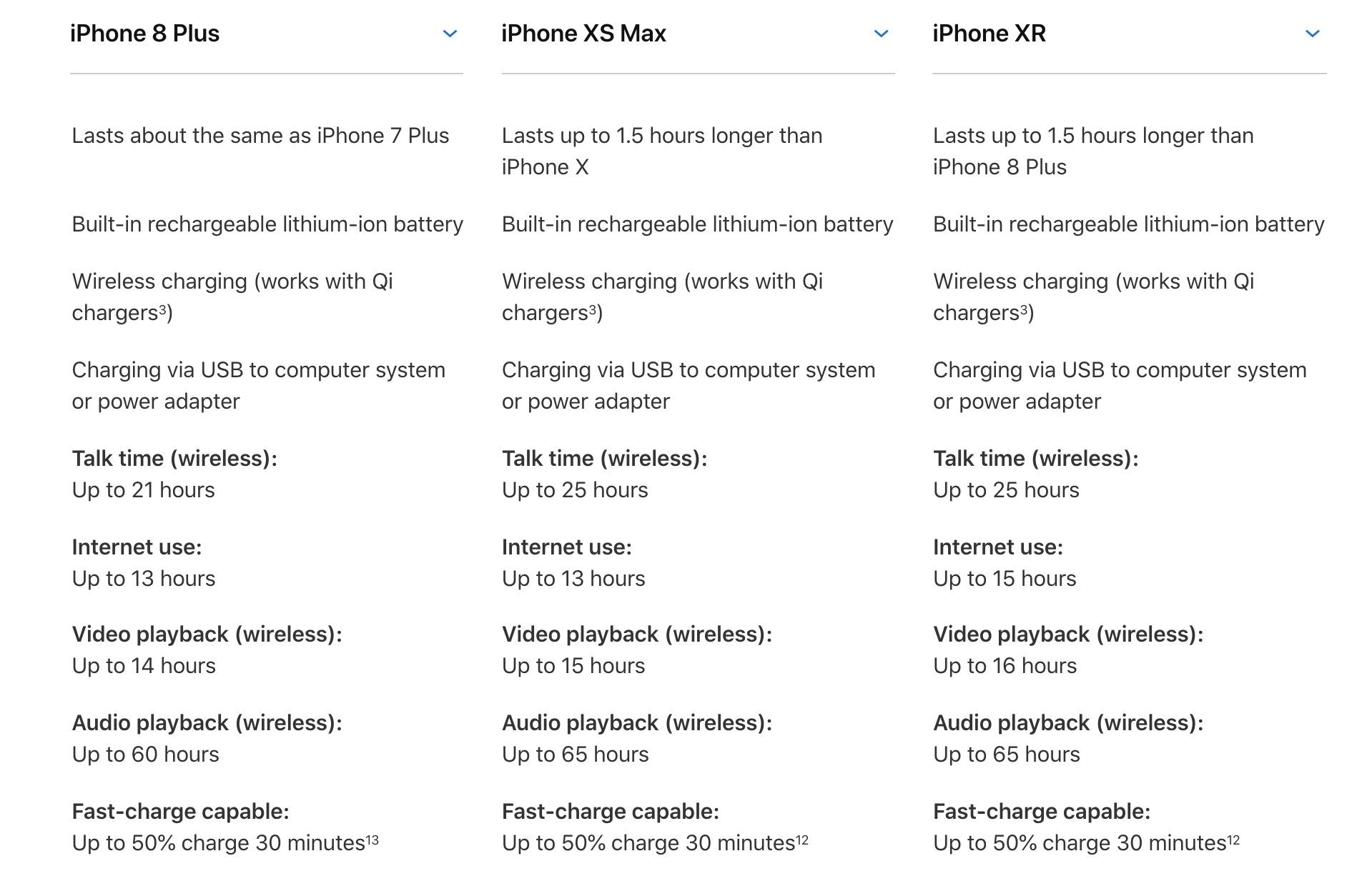 Theo như Apple công bố trong bảng thời lượng pin, iPhone Xr chính là một trong 2 chiếc smartphone có thời lượng pin tốt nhất của nhà Táo, chỉ kém iPhone Xs Max. Trong tất cả các chỉ số như thời gian đàm thoại, lướt internet, xem video và nghe nhạc hì thời lượng pin của iPhone Xr luôn vượt trội hơn so với iPhone Xs.