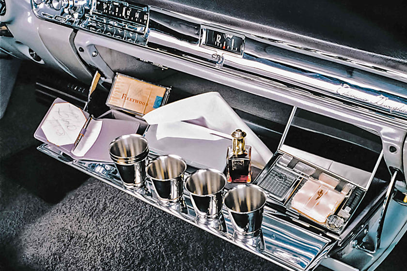 Vào những năm 1950, Cadillac đã thêm một quầy bar nhỏ vào mẫu xe Eldorado Brougham 1957 nằm gọn nhẹ bên trong hộc để đồ phía lái phụ… Các đồ dùng để thưởng thức rượu hay đồ uống khác gồm 4 cốc kim loại được gắn chặt bởi lực nam châm tác động giữa khay đồ và đế cốc. Tuy nhiên, thiết kế này sớm bị xu thế đưa khay đồ uống về hàng ghế thứ 2 lấn át bởi tính hợp lý hơn.