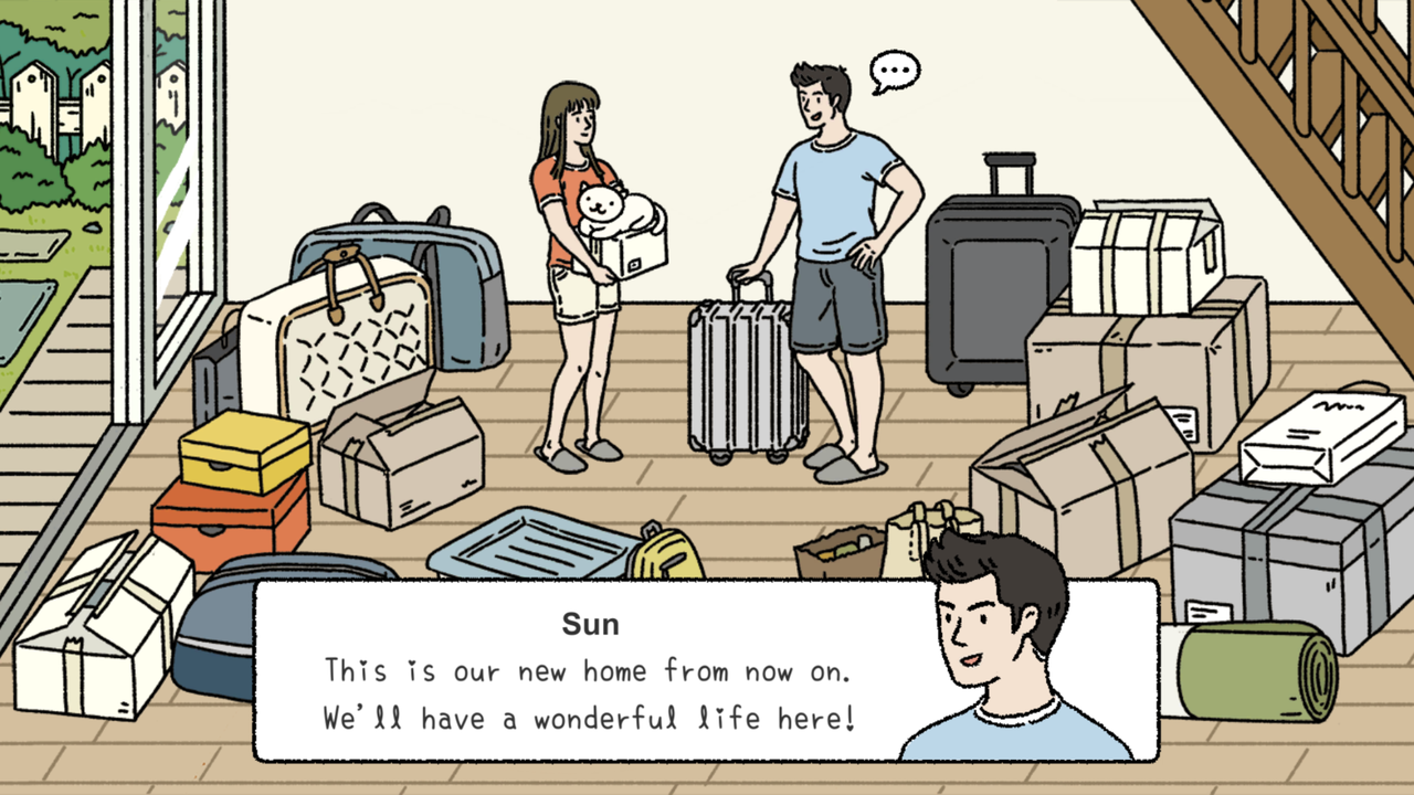 Khi bắt đầu chơi Adorable Home, bạn sẽ được lựa chọn nhân vật và người yêu của mình. Hai người vừa chuyển đến một căn nhà mới cùng với chú mèo trắng tên Snow.