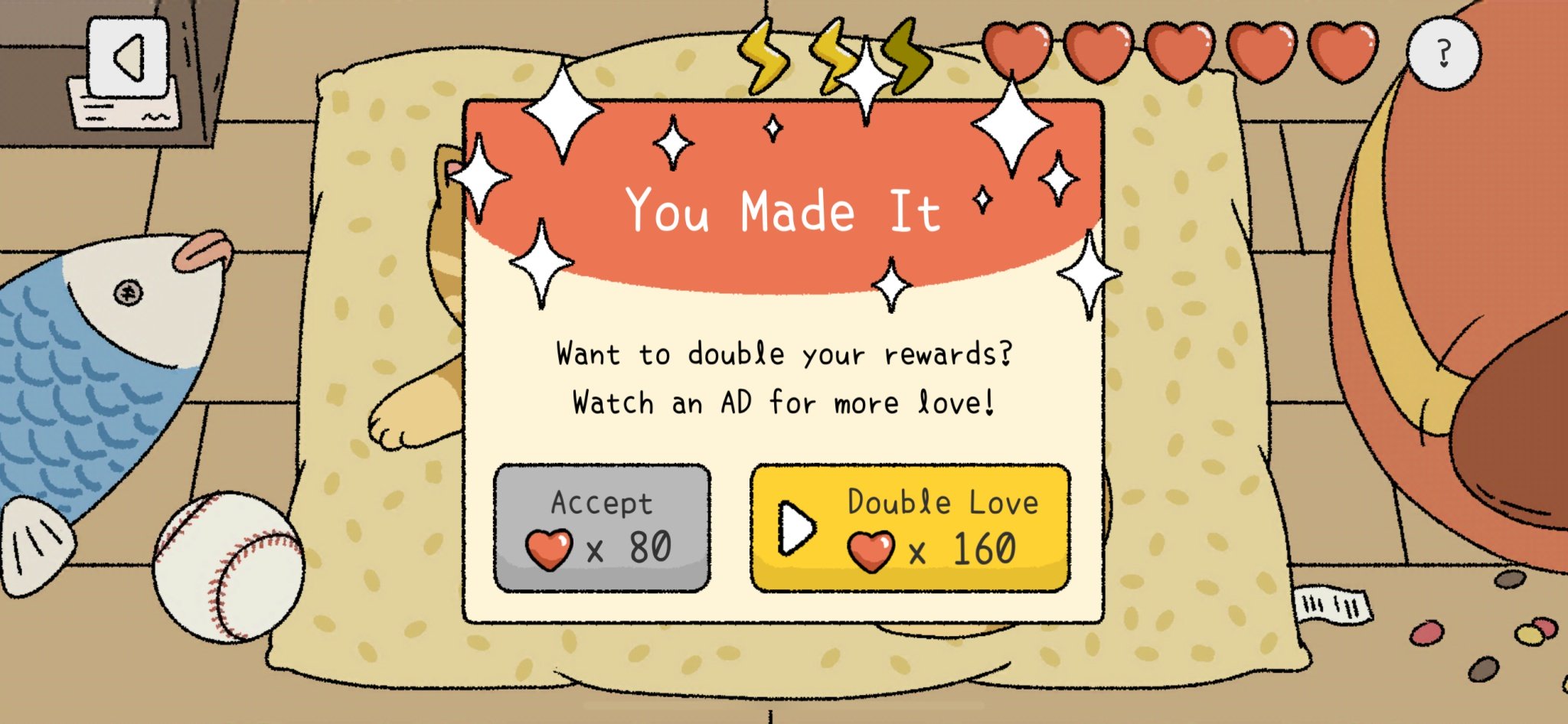 Sau khi hoàn thành một thử thách trong Adorable Home, người chơi sẽ được thưởng 80 tim/lần. Nếu xem quảng cáo, số tim này sẽ nhân lên 2 lần.