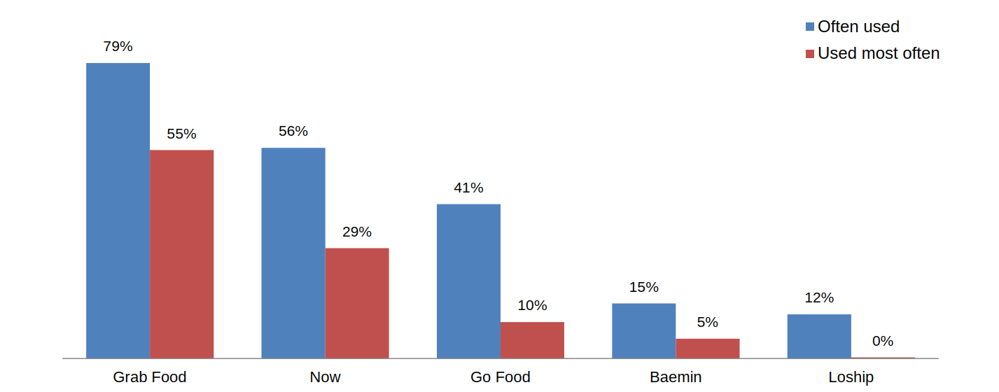 Theo kết quả một khảo sát mới đây cho Qandme thực hiện, GrabFood đang là dịch vụ giao đồ ăn được nhiều người sử dụng nhất tại Việt Nam. Cụ thể, có tới 55% số người tham gia khảo sát chọn GrabFood là dịch vụ giao đồ ăn được sử dụng thường xuyên nhất. Con số này của hai đối thủ xếp phía sau là Now và GoFood với số lượng người lựa chọn lần lượt là 56% và 41%. Baemin trong khi đó xếp thứ 4 với 5% số người tham gia khảo sát lựa chọn còn Loship chiếm tỉ trọng không đáng kể. Cũng trong khảo sát này, 79% số người tham gia chọn GrabFood là dịch vụ họ thường xuyên sử dụng, cao hơn so với 56% của Now và 41% của GoFood.