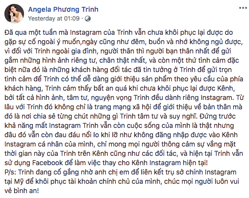 Tài khoản Instagram có gần 1 triệu người theo dõi của Angela Phương Trinh mới đây không còn sử dụng được, theo chính những chia sẻ của cô trên trang Facebook cá nhân. Người đẹp này theo đó chia sẻ tài khoản Instagram của mình vẫn “chưa khôi phục lại được do gặp sự cố ngoài ý muốn”. Tuy nhiên, cô không chia sẻ sâu thêm về lý do mà mình gặp phải mà chỉ cho biết đang cố gắng liên hệ với Instagram để được hỗ trợ khôi phục lại tài khoản chính chủ. Tài khoản Instagram của Angela Phương Trinh trước đó đã được gắn nút xác thực màu xanh.