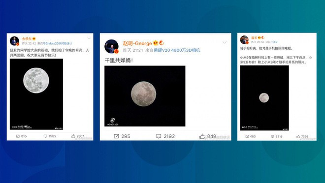 Một trào lưu được tạo dựng bởi các nhà sản xuất Trung Quốc trong thời gian gần đây là dùng smartphone để chụp ảnh mặt trăng. Hết Xiaomi, Honor rồi lại đến Huawei chia sẻ hình ảnh chụp trăng bằng smartphone của mình. Trong sự kiện ra mắt chiếc P30 Pro, Huawei cũng so sánh khả năng chụp trăng của chiếc máy này với hai đối thủ iPhone XS Max và Galaxy S10.