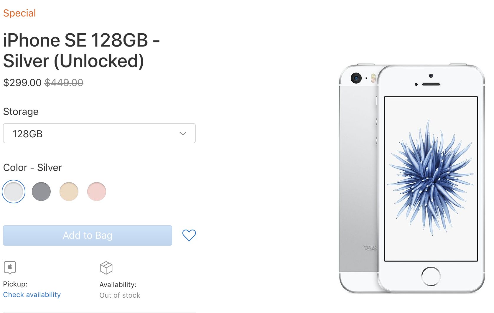 Trên cửa hàng trực tuyến Apple Store, những chiếc iPhone SE được giảm giá 100 USD cho phiên bản 32GB, còn 249 USD (5,8 triệu đồng) và 150 USD cho phiên bản 128GB, còn 299 USD (7 triệu đồng).