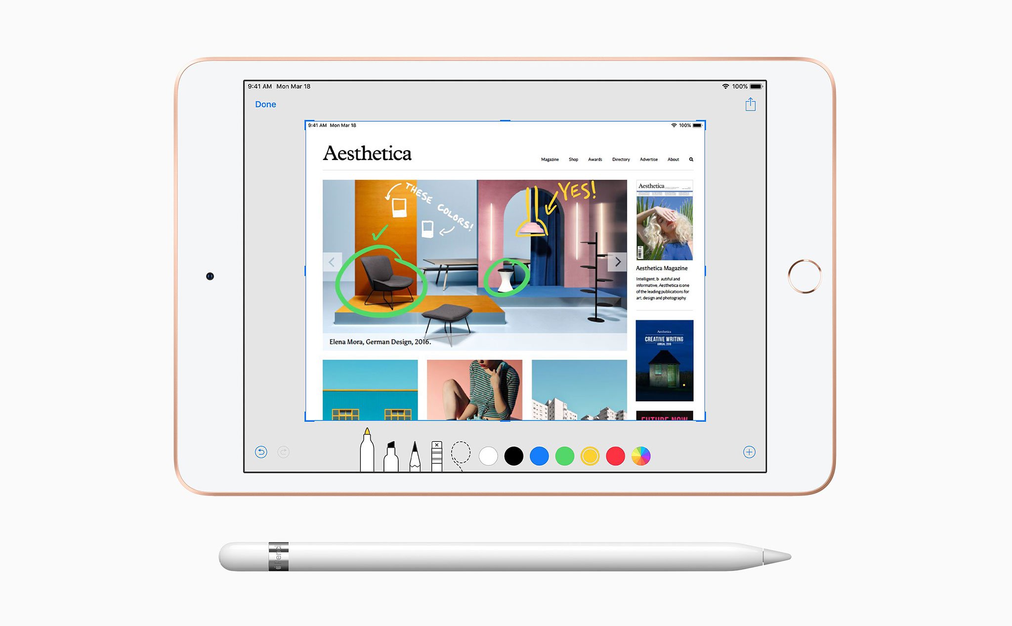Bên cạnh iPad Air mới, Apple cũng chính thức trình làng iPad Mini 5 sau hơn 3 năm quên lãng. iPad Mini 2019 rang bị màn hình Retina 7.9″ với viền trên và dưới khá dày kèm theo nút Home cứng. Dẫu vậy, màn hình của iPad Mini mới hỗ trợ thêm công nghệ True Tone hay gam màu rộng DCI-P3. Đặc biệt, iPad mini 5 hỗ trợ bút Apple Pencil, biến đây trở thành chiếc iPad với màn hình nhỏ nhất hỗ trợ cây bút này.