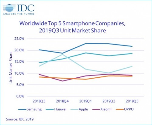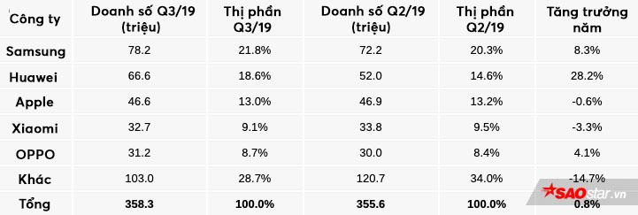 Trong top 5 những nhà sản xuất hàng đầu, Samsung xếp ở vị trí sô1 với 78,2 triệu máy điện thoại bán ra, tương đương với 21,8% thị phần và tăng trưởng 8,3% so với cùng kì năm trước. Ở vị trí số hai là nhà sản xuất Trung Quốc Huawei với 66,6 triệu máy bán ra, chiếm 18,6% thị phần điện thoại toàn cầu. Điều đáng nói hơn là việc Huawei đang đón nhận mức tăng trưởng so với cùng kì năm trước lên tới 28,2%. Trong bối cảnh thương chiến Mỹ - Trung khốc liệt và Huawei đang bị Mỹ đưa vào “danh sách đen”, phần lớn động lực tăng trưởng của hãng này đến từ nội địa Trung Quốc.