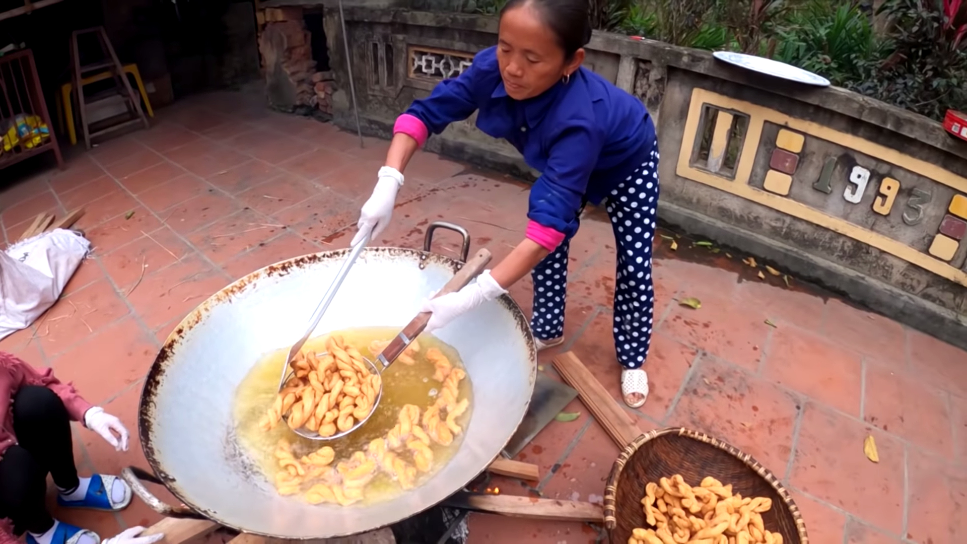 Bà Tân cho từng chiếc bánh quẩy vào chảo chiên vàng giòn lên. (Ảnh: Bà Tân Vlog)