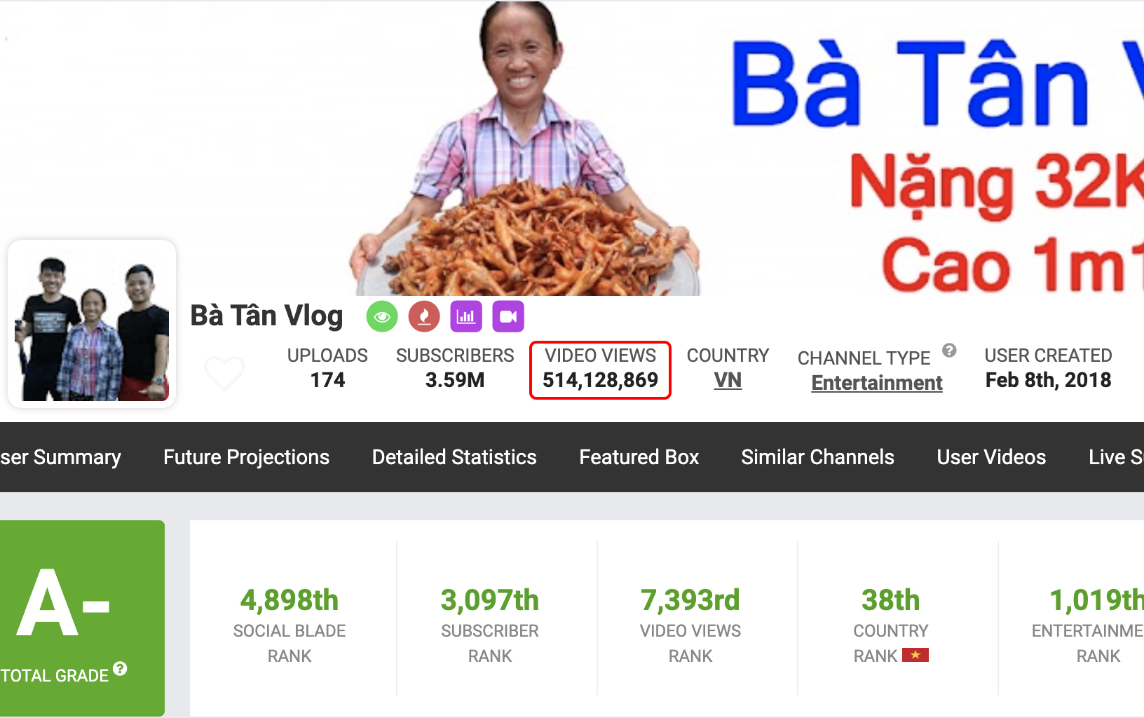 Theo ghi nhận của SocialBlade, chuyên trang thống kê chuyên theo dõi hoạt động của các tài khoản mạng xã hội và YouTube, kênh YouTube của Bà Tân Vlog đạt mốc 500 triệu lượt xem vào hôm 11/3. Và cho đến hiện tại, kênh YouTube này đã có thêm 14 triệu lượt xem.