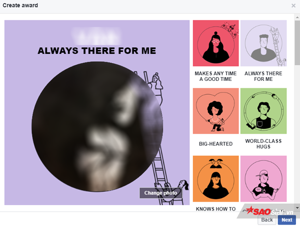 Bên cạnh đó, bạn cũng có thể tự tạo ra các phần thưởng cho người bạn của mình từ danh sách có sẵn nhưng rất đa dạng Facebook đưa ra. Tên các giải thích đều cực kì thú vị và dễ thương, ví dụ như Always there for me (lúc nào cũng ở bên cạnh), big-hearted (trái tim rộng lớn), great listener (người biết lắng nghe), actually keeps secrets (luôn giữ bí mật)… để bạn tùy ý khám phá.