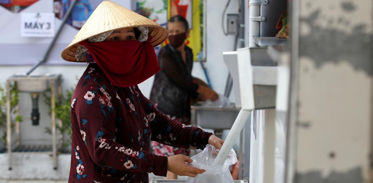 Một phụ nữ ở TP.HCM nhận gạo từ “ATM gạo” (Ảnh: Reuters / Yen Duong)