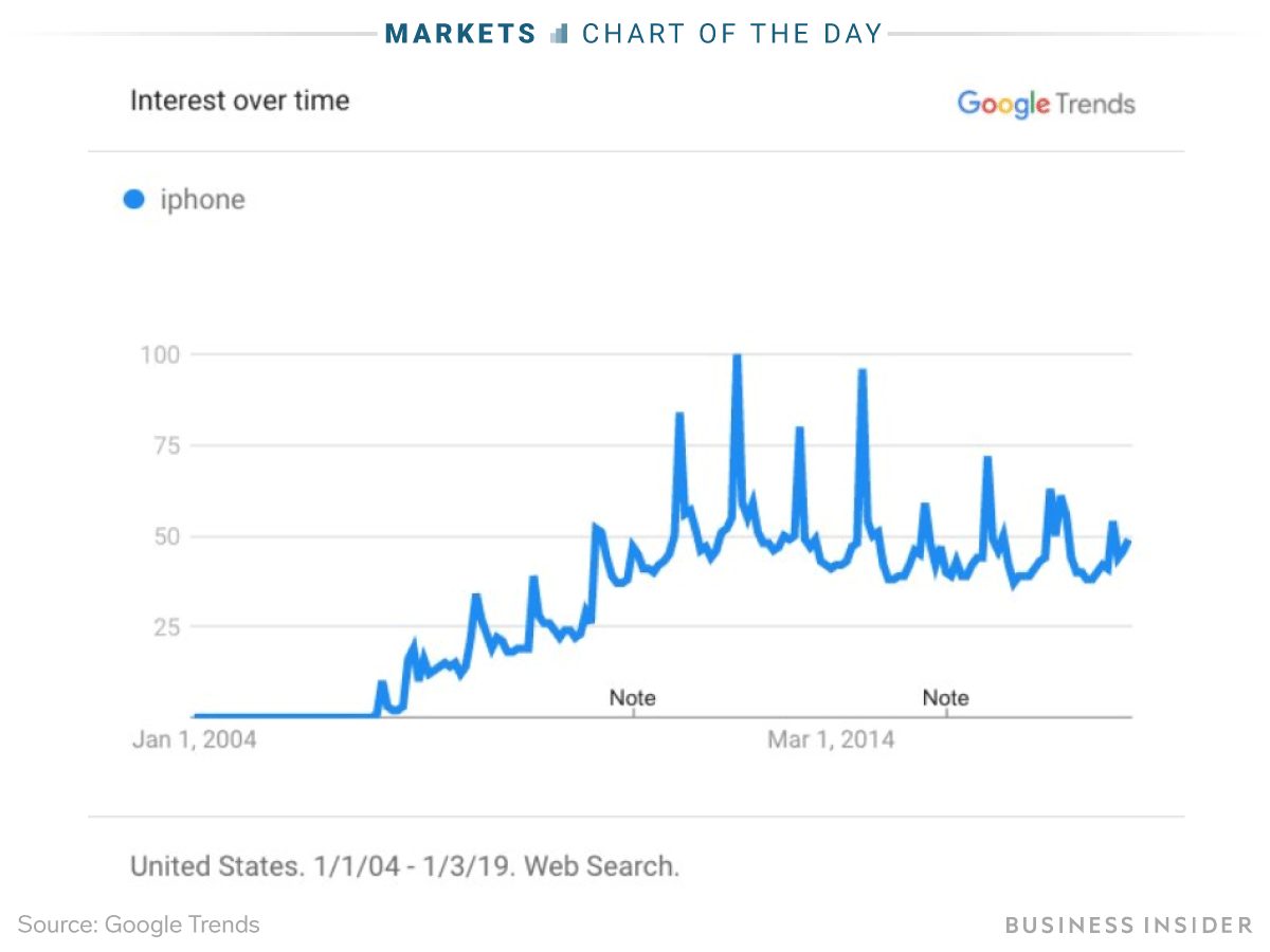 Một nhà phân tích từ DataTrek Research cho thấy mối quan tâm dành cho iPhone đã đạt đỉnh tại Mỹ từ tháng 9 năm 2012 khi iPhone 5 lên kệ. Tháng 9 năm 2014, sự quan tâm dành cho chiếc điện thoại của Apple cũng đạt đỉnh ấn tượng tại Hong Kong khi iPhone 6 chính thức ra mắt. Thế nhưng, kể từ sau đó, mối quan tâm của người dùng Google cho iPhone đã đi xuống trong bối cảnh giá máy trung bình tăng cao, chất lượng máy được duy trì nên người dùng cũng ngần ngại cập nhật thiết bị của mình hơn.
