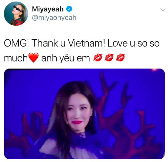 Hôm qua (26/10), Sunmi (cựu thành viên nhóm Wondergirls) cùng nhóm nhạc SEVENTEEN đã có mặt tại Việt Nam để tham gia biểu diễn tại một sự kiện âm nhạc. Chứng kiến sự cuồng nhiệt của khán giả Việt Nam, Sunmi đã chia sẻ sự bất ngờ và đáp lại tình cảm của người hâm mộ bằng một dòng tweet vô cùng mùi mẫn. Cô thậm chí còn sử dụng Tiếng Việt khiến fan Việt sướng mê, nhưng lại có một điểm khiến người ta chú ý hơn cả.