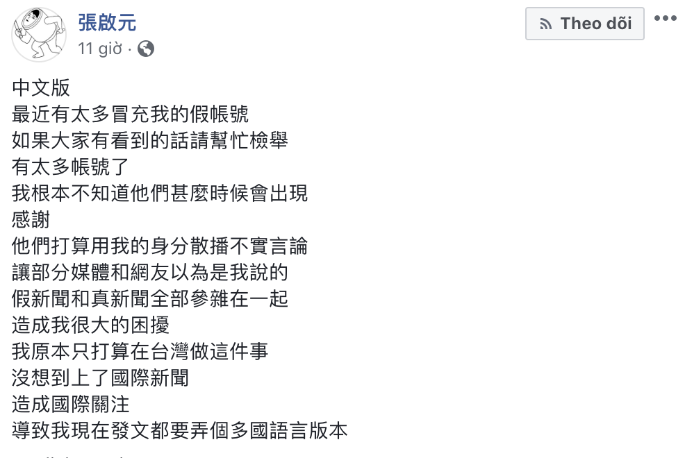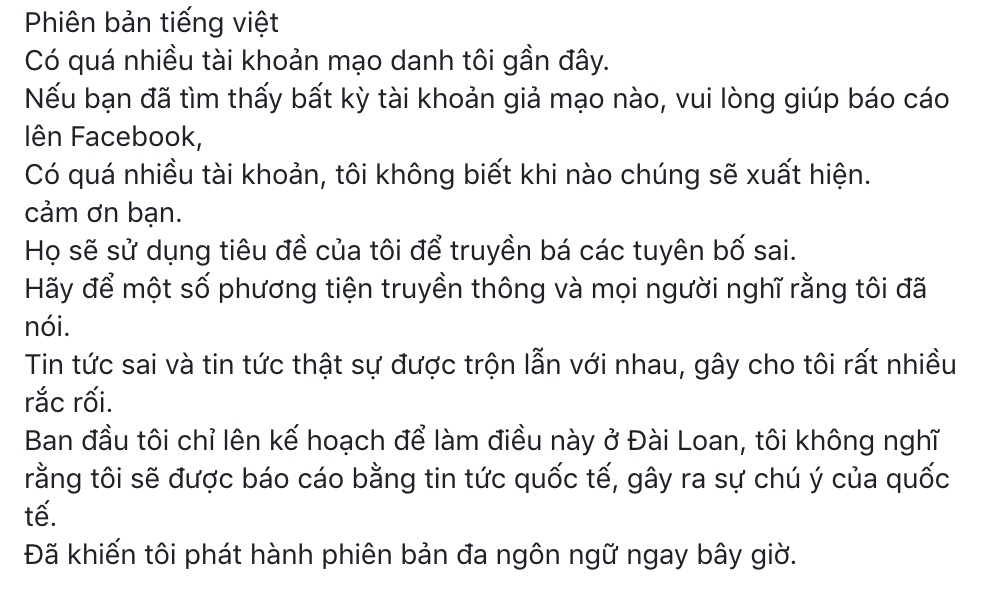 “Có quá nhiều tài khoản mạo danh tôi gần đây. Nếu bạn đã tìm thấy bất kỳ tài khoản giả mạo nào, vui lòng giúp báo cáo lên Facebook,