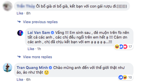 Nhà báo Lại Văn Sâm để lại những bình luận hóm hỉnh trên bài đăng của mình, trong khi đó nhà báo Trần Quang Minh cũng để lại lời chào mừng đến với Facebook cùng người đàn anh.