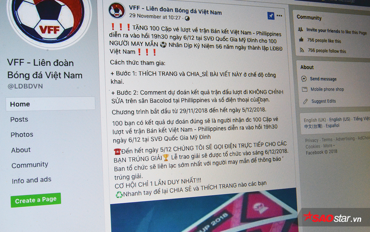 Mới đây, một tài khoản Facebook có tên “VFF - Liên đoàn Bóng đá Việt Nam” đã tung ra thông tin tặng 100 cặp vé lượt về trận bán kết Việt Nam - Philippines. Tất cả những gì người dùng cần làm là nhấn thích trang, chia sẻ bài viết, đưa ra kết quả dự đoán trận bán kết lượt đi AFF Cup 2018 và để lại số điện thoại. Không khó để nhận ra đây là một chiêu lừa đảo bởi thực tế đây không phải tài khoản chính thức của Liên đoàn Bóng đá Việt Nam (không có dấu tick xanh xác thực) và VFF cũng không đưa ra bất kì thông tin tặng vé nào tương tự trong thời gian gần đây. Dù vậy, bài đăng này vẫn đang thu hút được hàng nghìn bình luận.