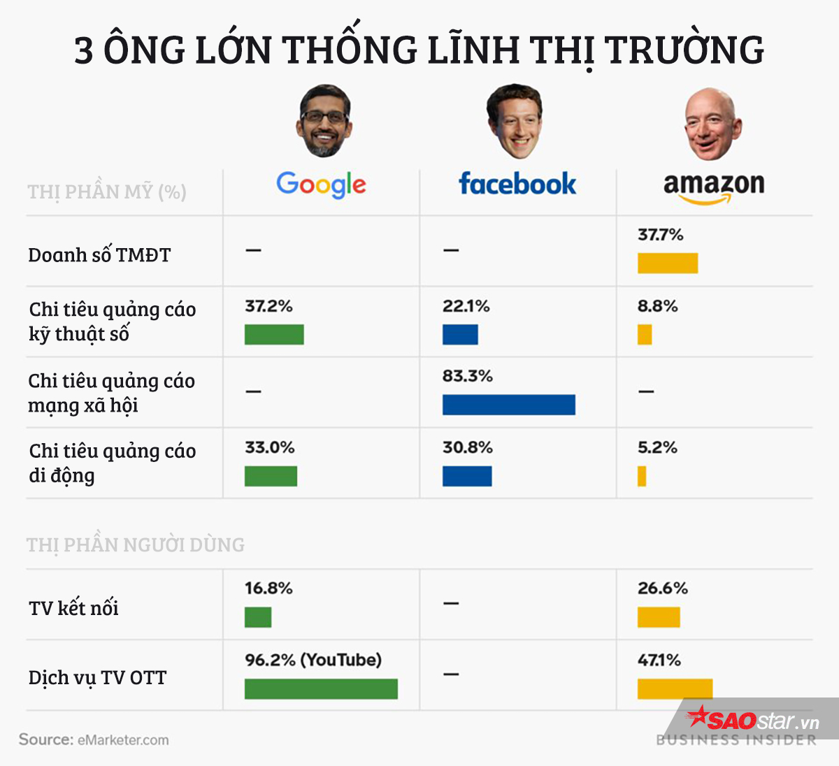 Google, Facebook và Amazon là ba trong số những công ty công nghệ giá trị nhất trên thế giới. Ở biểu đồ dưới đây, dựa trên dữ liệu từ eMarketer, bạn sẽ dễ dàng thấy được sự thống trị của chúng. Business Insider cho biết chứ 3 USD được thị trường chi tiêu vào hoạt động quảng cáo kĩ thuật số tại Mỹ thì có 2 USD rơi vào tay của một trong ba công ty nói trên. Facebook, không quá ngạc nhiên, khi là một công ty có thị phần ấn tượng ở mảng quảng cáo trên mạng xã hội trong khi đó cũng đang dần xoá nhoà khoảng cách với Google ở mảng quảng cáo trên di động.
