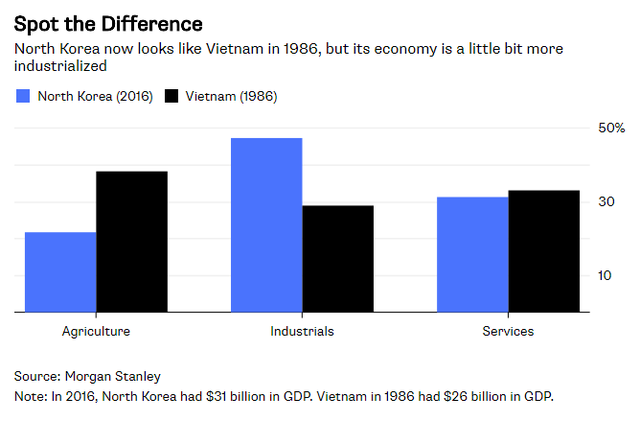 Hiện đầu tư nước ngoài chiếm đến 26% GDP của Việt Nam và nếu Triều Tiên thu hút được các dòng vốn quốc tế từ mức 0% hiện nay lên 20% GDP thì hãng Morgan Stanleu ước tính nền kinh tế này có thế tăng trưởng tới 5%.