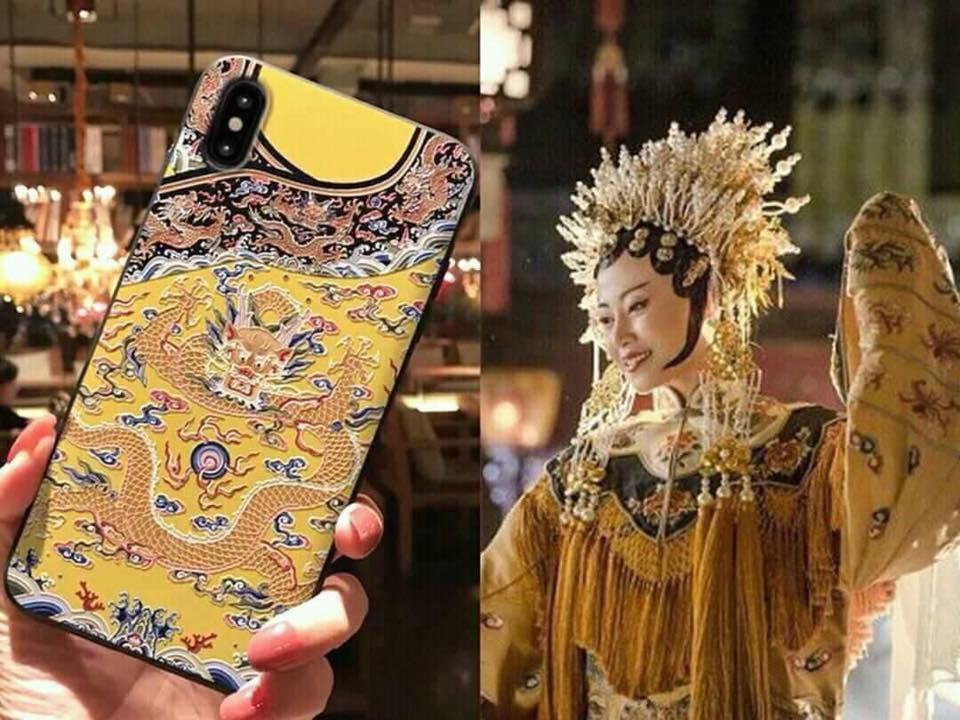 Lấy cảm hứng từ trang phục của Hoàng đế Càn Long, chiếc ốp lưng này có màu vàng chủ đạo và hoạ tiết thiết kế rất “hoành tráng”.