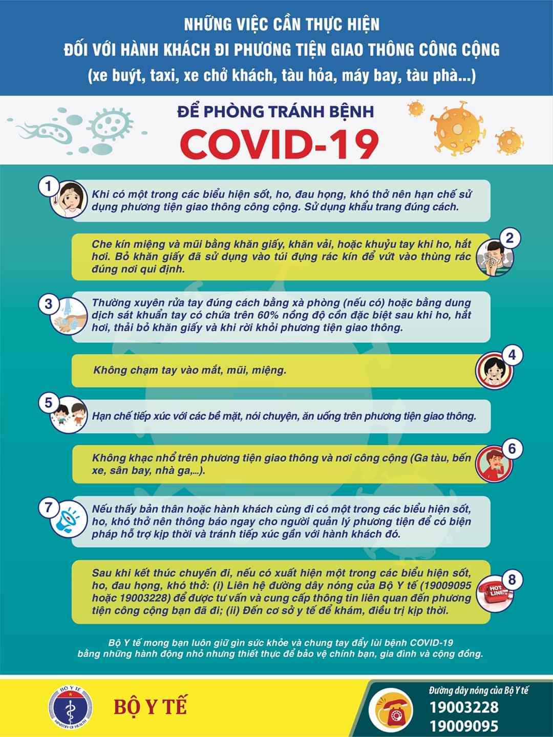 Khuyến cáo phòng chống COVID-19 cho Hành khách đi phương tiện giao thông công cộng (xe buýt, taxi, tàu hoả, máy bay,…). (Ảnh: Bộ Y Tế)