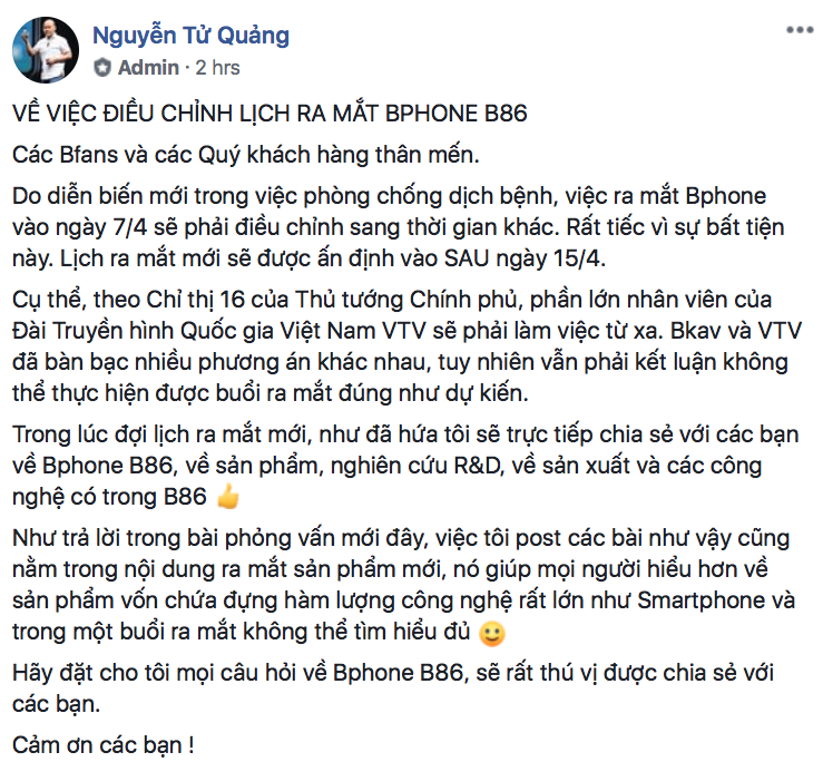 Thông báo hoãn ra mắt Bphone B86 của CEO BKAV Nguyễn Tử Quảng.