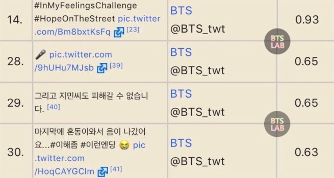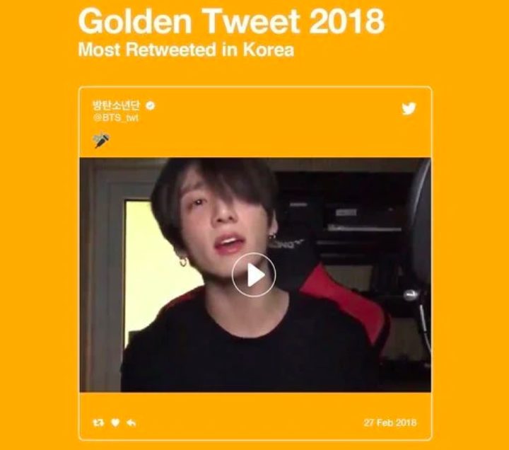 Điều thú vị là JungKook (BTS) là người thực hiện ba trong số bốn bài đăng cực kì thành công và có tính lan truyền cao này, bao gồm bài đăng cover lại “All Of My Life” đứng số 28 (652.000 lượt retweet), bài đăng cover lại “Scenery” đứng số 29 (649.000 lượt retweet) và bài đăng cover lại “Ending Scene” đứng số 30 (631.000 lượt retweet). Thức tế, trước đó, bài đăng trong đó JungKook cover lại “All Of My Life” đã được chọn “Golden Tweet 2018” trong vai trò dòng tweet được đăng lại nhiều nhất tại Hàn Quốc.