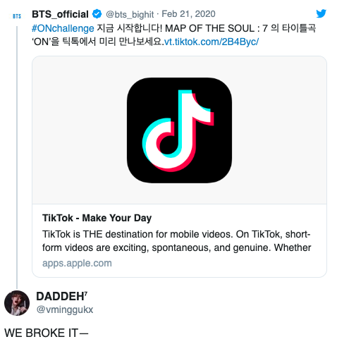 Dù vậy, trang The Verge dẫn lời người phát ngôn của TikTok lại cho biết vấn đề nói trên với TikTok là do một đường link dẫn tới bài hát của BTS đã bị lỗi. Người này khẳng định đây không phải lỗi do ứng dụng mà “đường link tới bài hát phải được cập nhật.”