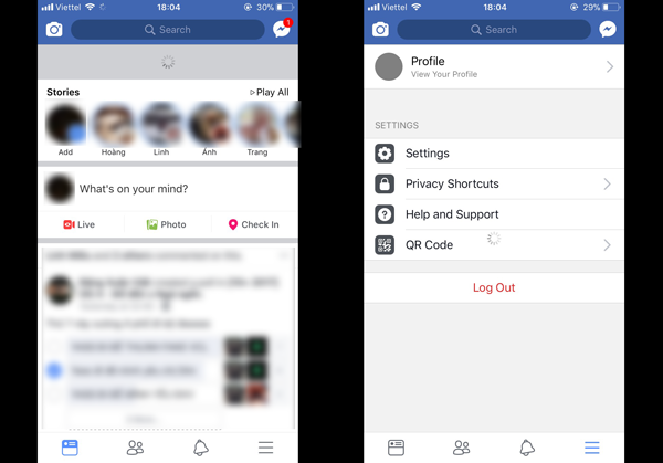 Trên ứng dụng Facebook, News Feed không thể tải và cập nhật mới, đồng thời phần menu hệ thống không thể hiện đầy đủ các chức năng và phân mục thường thấy: