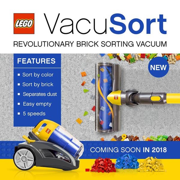 Nhân dịp ngày cá tháng tư, LEGO đã cho ra mắt một sản phẩm siêu hoành tráng, đó chính là chiếc máy hút LEGO có khả năng hút hết tất cả những mẫu LEGO vương vãi và tự động phân loại chúng theo tiêu chí hình dạng, màu sắc. Nếu bạn đã từng phát điên vì phải dọn dẹp đống hỗn độn của tụi nhỏ, hãy liên hệ với LEGO và đặt ngay tức thì sản phẩm để đến khi nào hãng…chế tạo xong thì đến lấy nhé.