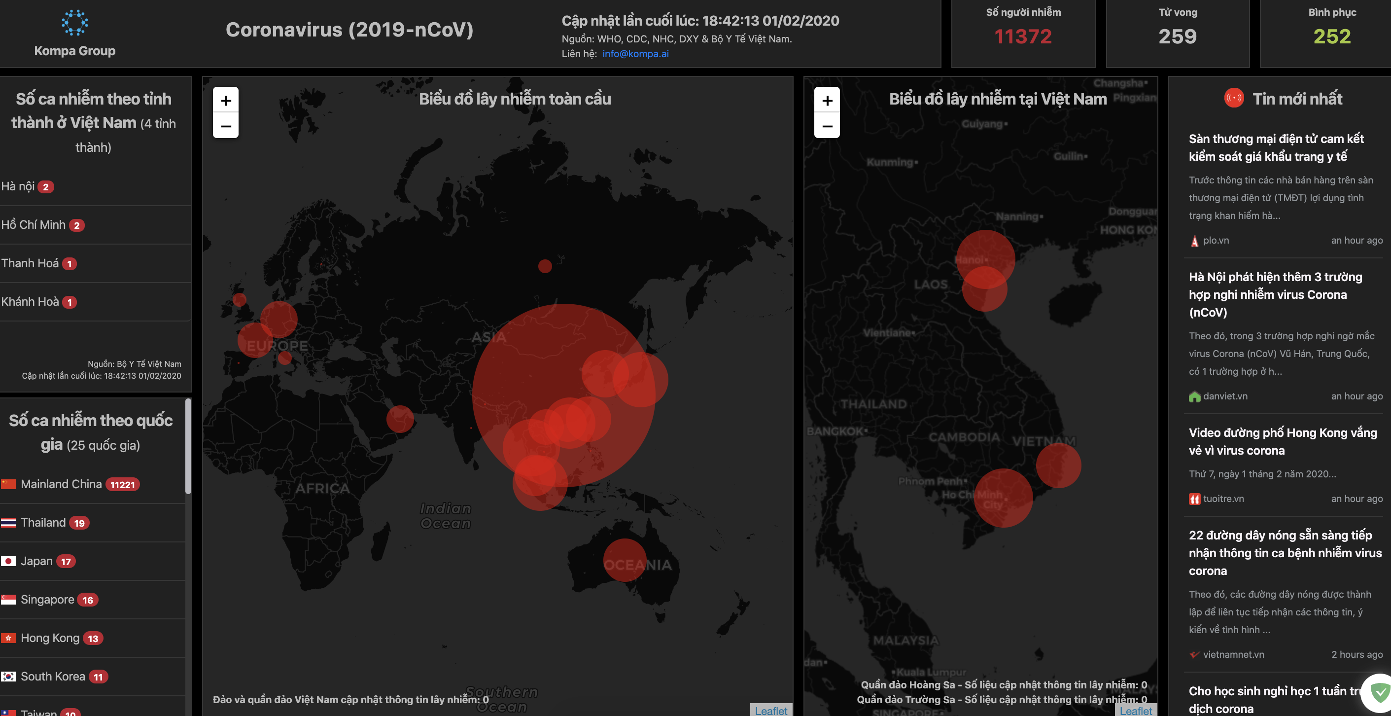 Trang web giúp cập nhật tình hình về virus corona do Kompa Group tạo ra có hỗ trợ tiếng Việt, và tập trung hiển thị thông tin nhanh nhất về tình hình dịch bệnh trên lãnh thổ Việt Nam.