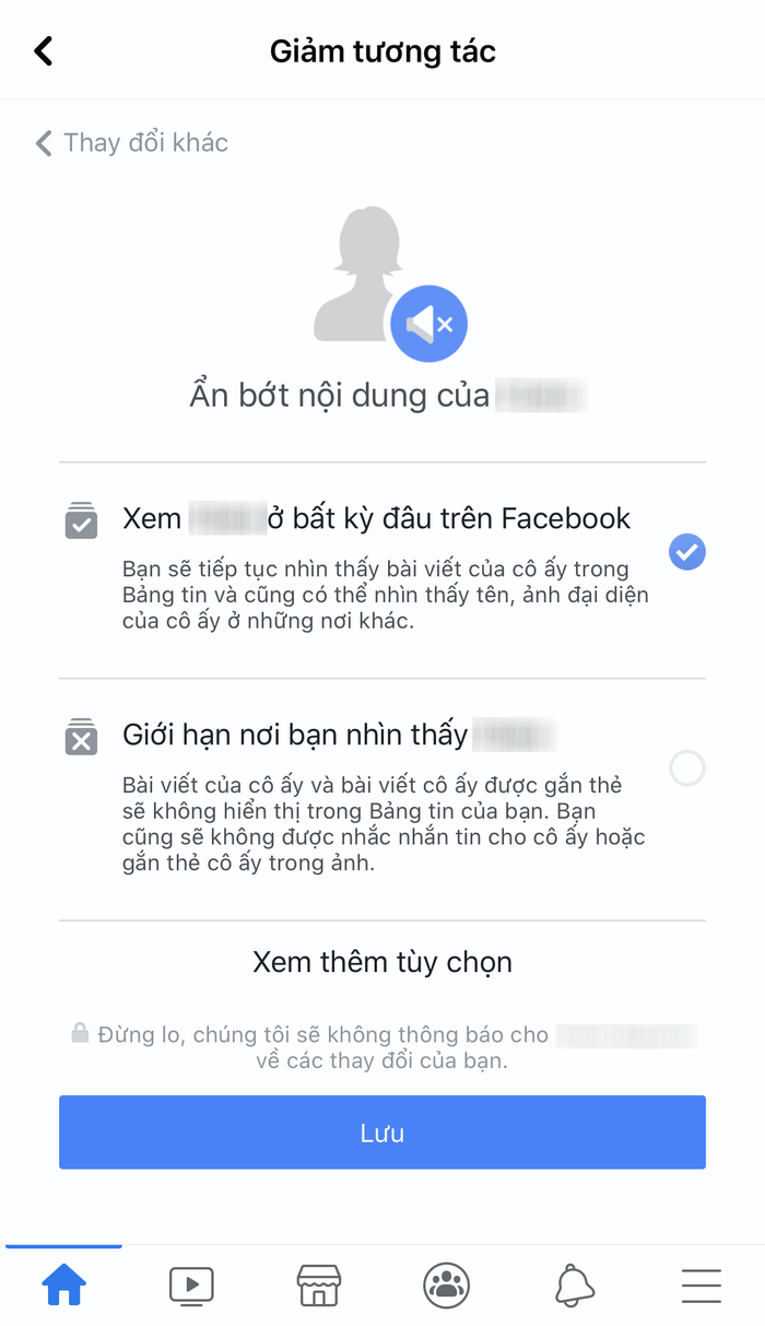 Tại các tuỳ chọn này, Facebook sẽ gợi ý cho bạn những tinh chỉnh phù hợp nhất để giảm tương tác với đối phương, bạn chỉ việc chọn những cài đặt phù hợp nhất và nhấn Lưu lại là xong.