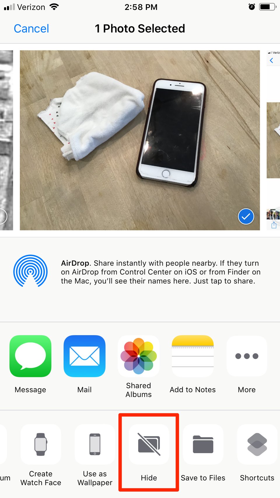 3. Ở thanh taskbar ở cuối màn hình, cuộn về bên phải, người dùng có thể thấy tuỳ chọn “Hide” với chức năng giấu ảnh.