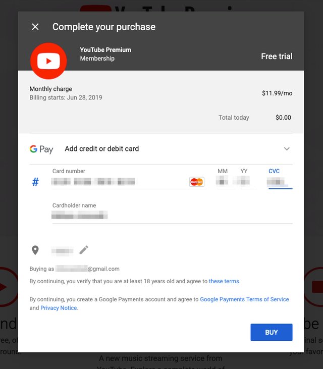 3. Người dùng tiếp theo cần nhập vào các thông tin thanh toán và một số thông tin cá nhân khác, ví dụ như mã bưu điện. Ở thời điểm hiện tại, YouTube Premium đang triển khai cho phép người dùng sử dụng thử dịch vụ trong vòng một tháng. Vì thế, nếu như đây là lần đăng kí đầu tiên của bạn, bạn sẽ không bị tính phí 11,99 USD cho tới khi thời điểm một tháng trôi qua. Dù vậy, ở thời điểm đăng kí, YouTube có thể thu phí của người dùng 1 USD để đảm bảo các thông tin bạn nhập vào là chính xác. Số tiền này sẽ được hoàn lại sau đó.