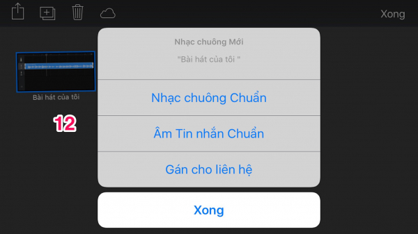 12. Bạn có thể chọn đoạn nhạc vừa tạo để cài làm “Nhạc chuông”, “Âm tin nhắn” hoặc sử dụng để dùng làm âm báo riêng cho mỗi liên hệ với “Gán cho liên hệ”.