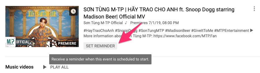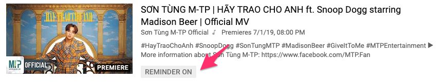 Để nhận được thông báo cho video mới của Sơn Tùng, tất cả những gì bạn cần làm là nhấn vào nút Set Reminder bên cạnh video đã được đăng trên kênh của nam ca sỹ này.