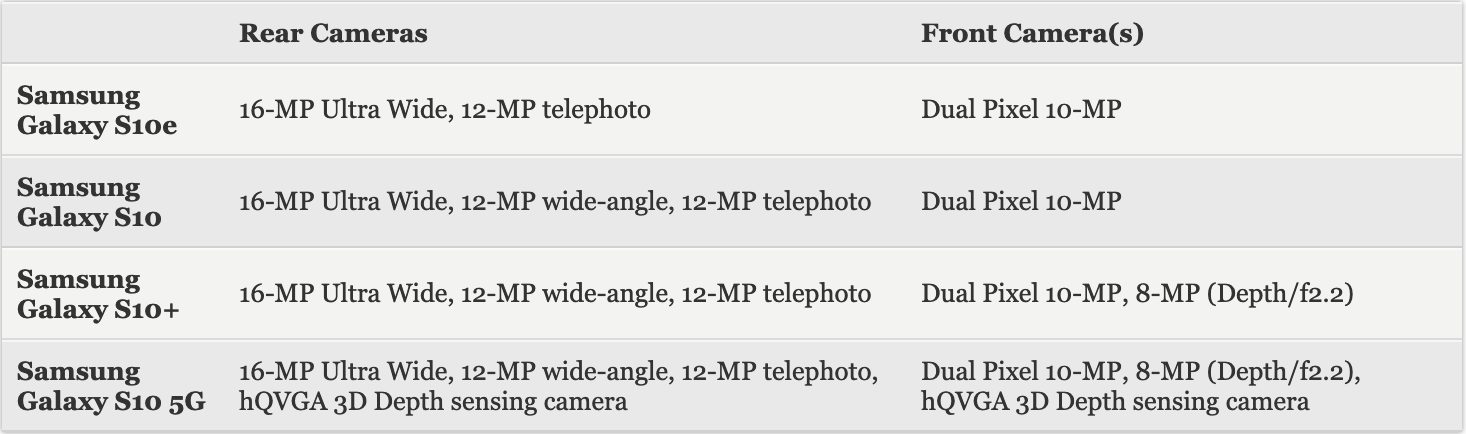 - Galaxy S10: S10 trang bị camera selfie Dual Pixel 10MP. Ở mặt lưng của thiết bị sở hữu cụm 3 camera: một camera góc rộng Dual Pixel 12MP và một camera telephoto zoom 12MP, hỗ trợ chế độ chụp ảnh góc siêu rộng nhờ một ống kính Ultra Wide 16MP, cho phép bạn chụp chủ thể siêu cận cảnh 0.5x hoặc chụp những bức ảnh phong cách với góc nhìn rộng đến choáng ngợp.