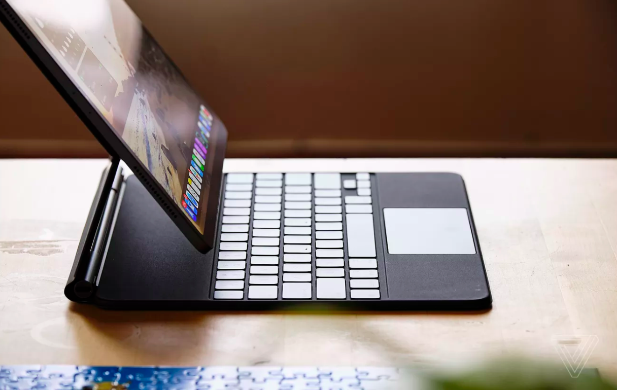 iPad Pro không được gắn có định theo một góc nghiêng trên Magic Keyboard. Thay vào đó, Apple sử dụng lối thiết kế “màn hình trôi nổi” và đây chính là điểm độc đáo của dòng sản phẩm này bởi nó khiến màn hình di chuyển tới gần mắt người dùng hơn và màn hình cũng gần ngón tay người dùng hơn khi họ cần tương tác cảm ứng. Màn hình khi gắn trên Magic Keyboard có thể điều chỉnh từ 90 độ đến 130 độ.