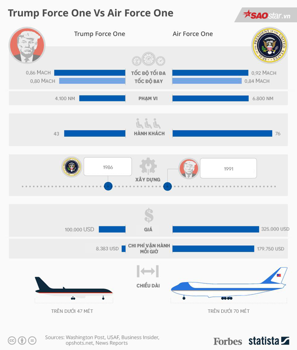 Hãy cùng so sánh một số đặc điểm của Air One Force và Trump Force One.