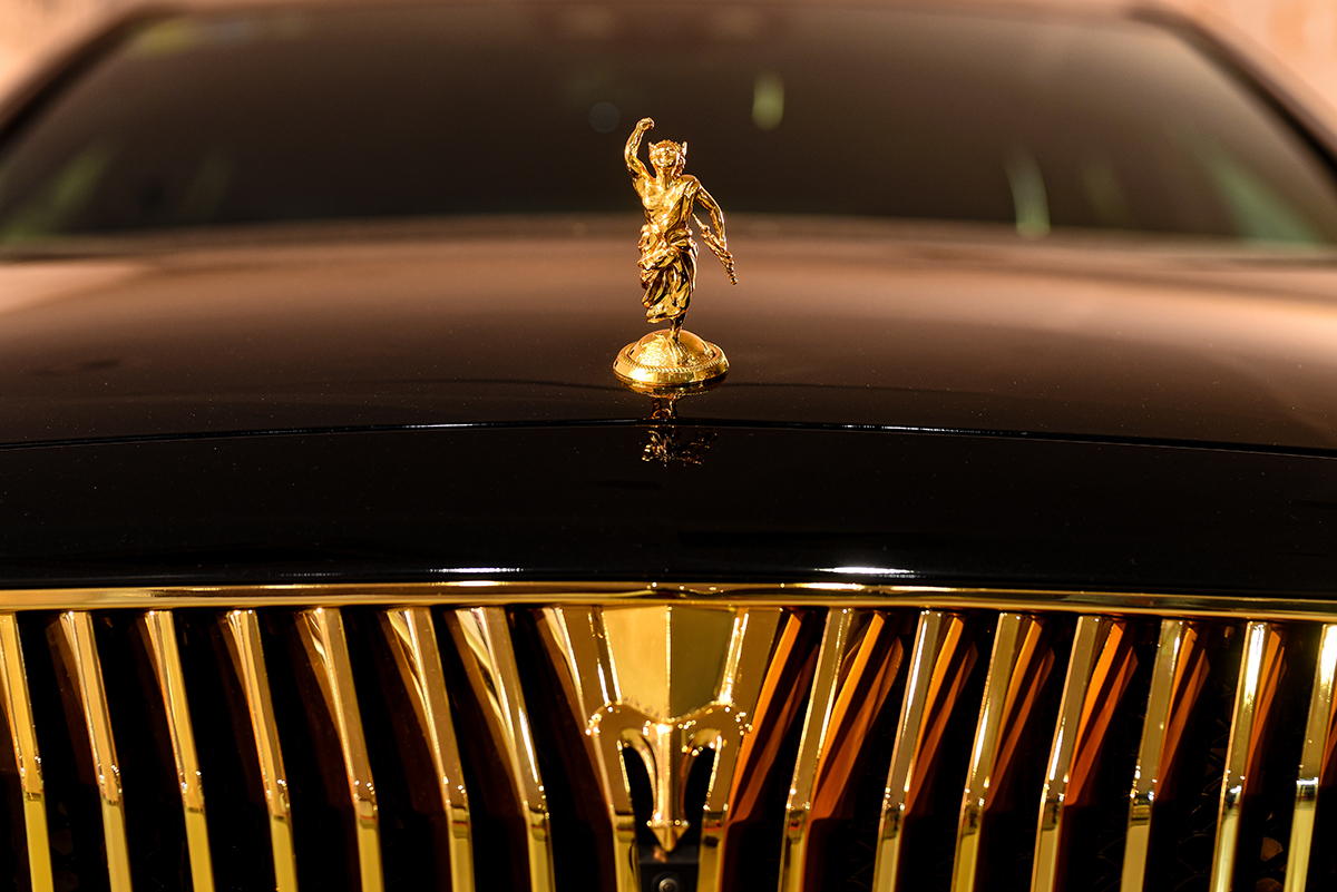 Cận cảnh bức tượng thần với hướng bay lên nằm ở phần mui xe. Bên dưới là lưới tản nhiệt mã vàng theo phong cách đấu sỹ Hy Lạp.