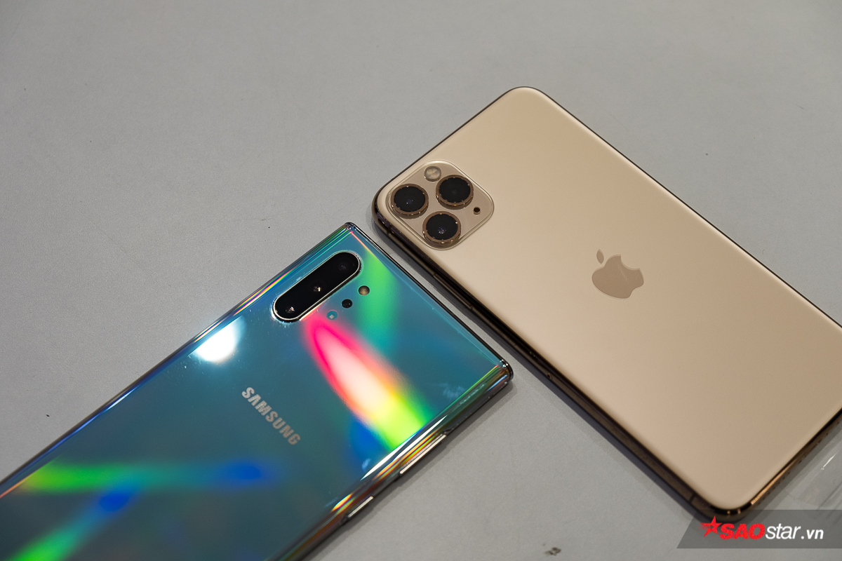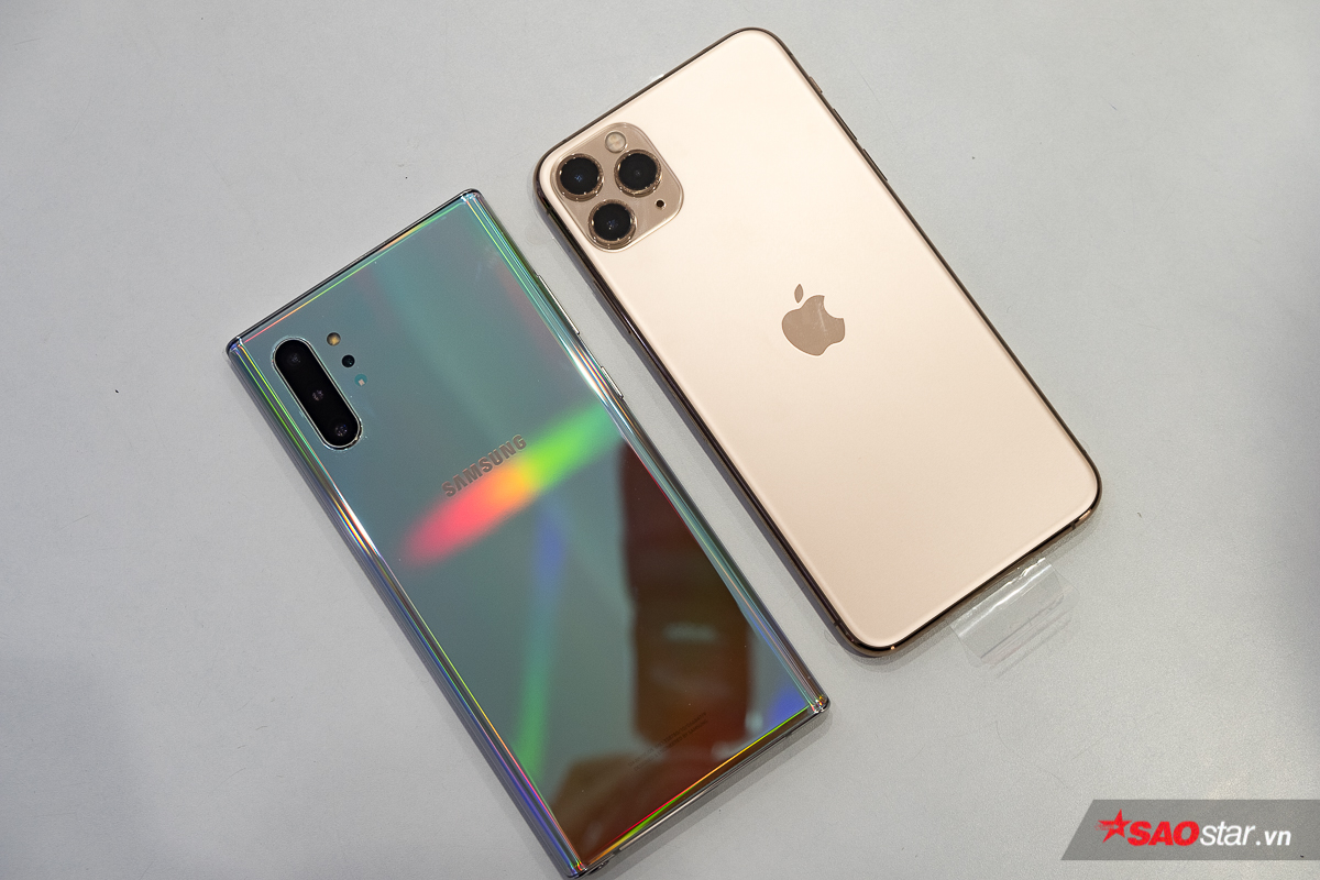 iPhone 11 Pro Max đặt cạnh chiếc Samsung Galaxy Note 10 của Samsung. Chiếc điện thoại của ông lớn công nghệ Hàn Quốc trông bóng bẩy hơn khá nhiều.