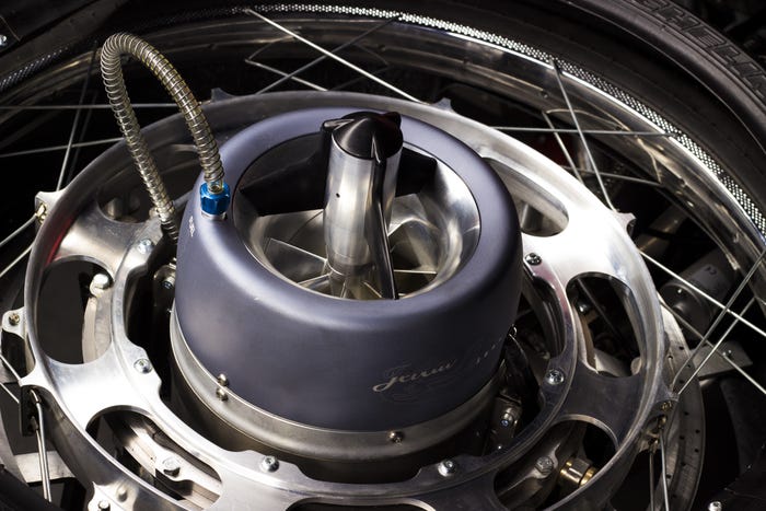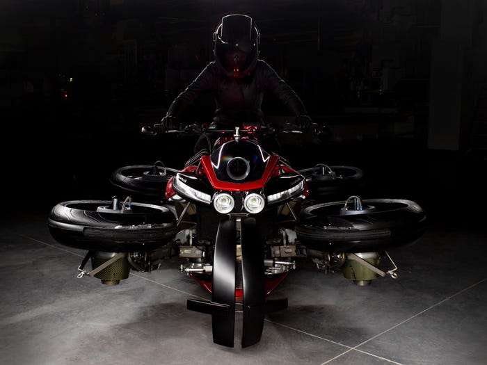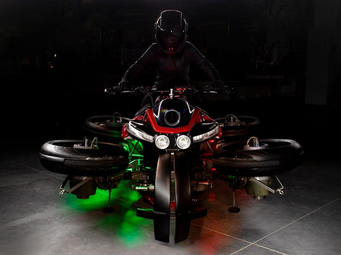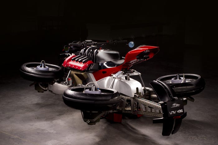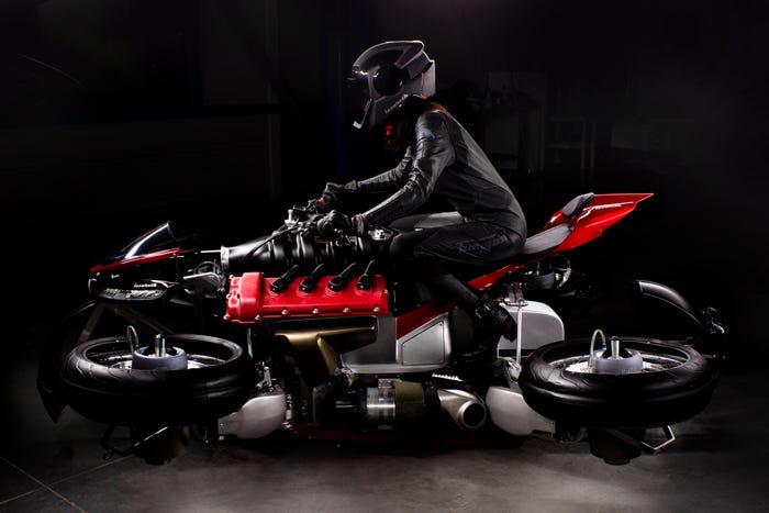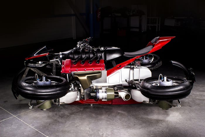 Nhờ động cơ chạy bằng dầu hoả, chiếc xe máy này có thể duy trì trạng thái bay trong 10 phút liên tục. (Ảnh: Lavareth)