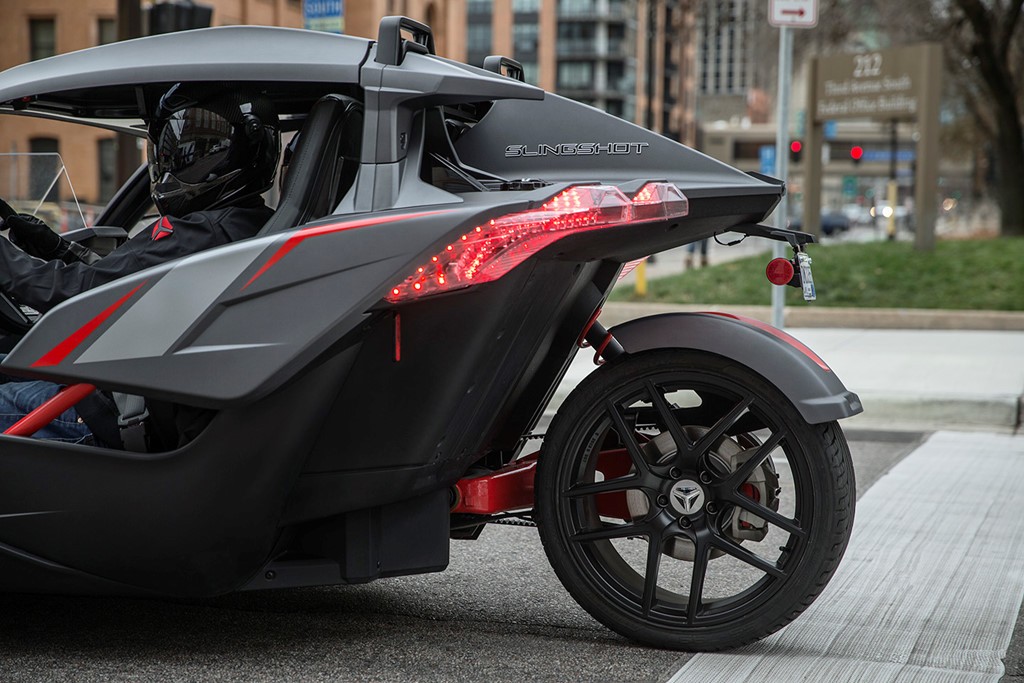 Polaris Slingshot có thiết kế tương đối đặc biệt với ba bánh, hai bánh ở cầu trước và bánh đơn ở sau. Khách hàng tiềm năng của hãng là những người yêu thích tốc độ, phong cách cũng như thích gây sự chú ý.