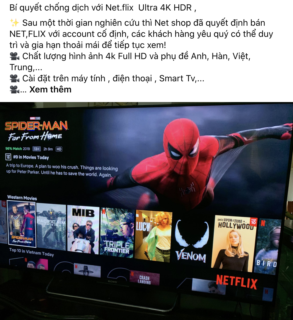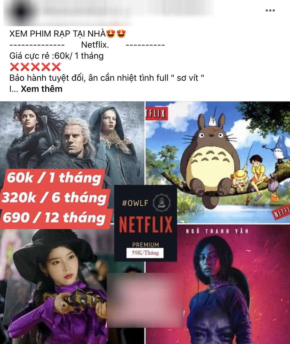“Mình đang bán gói Netflix giá rẻ gồm 65.000 đồng/tháng và 185.000 đồng/3 tháng. Cam kết không đổi tài khoản mỗi tháng với chất lượng video cao nhất là 4K”, một quảng cáo có nhiều tương tác trên Facebook.