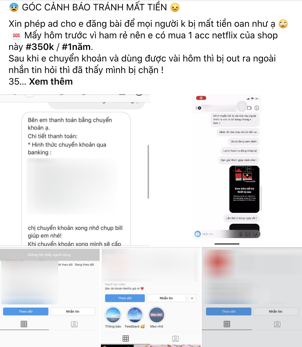 Người dùng Quang Huy (Hà Nội) cũng là một nạn nhân của chiêu lừa bán tài khoản Netflix giá rẻ này cho biết: “Thấy bên bán hàng chia sẻ khá thân thiện, hướng dẫn cũng nhiệt tình nên mình quyết định mua gói Netflix Premium với giá 65.000 đồng. Tuy nhiên, khi chuyển khoản thành công thì mình bị bên đó chặn liên hệ. Mọi người cảnh giác kẻo bị lừa nhé.”