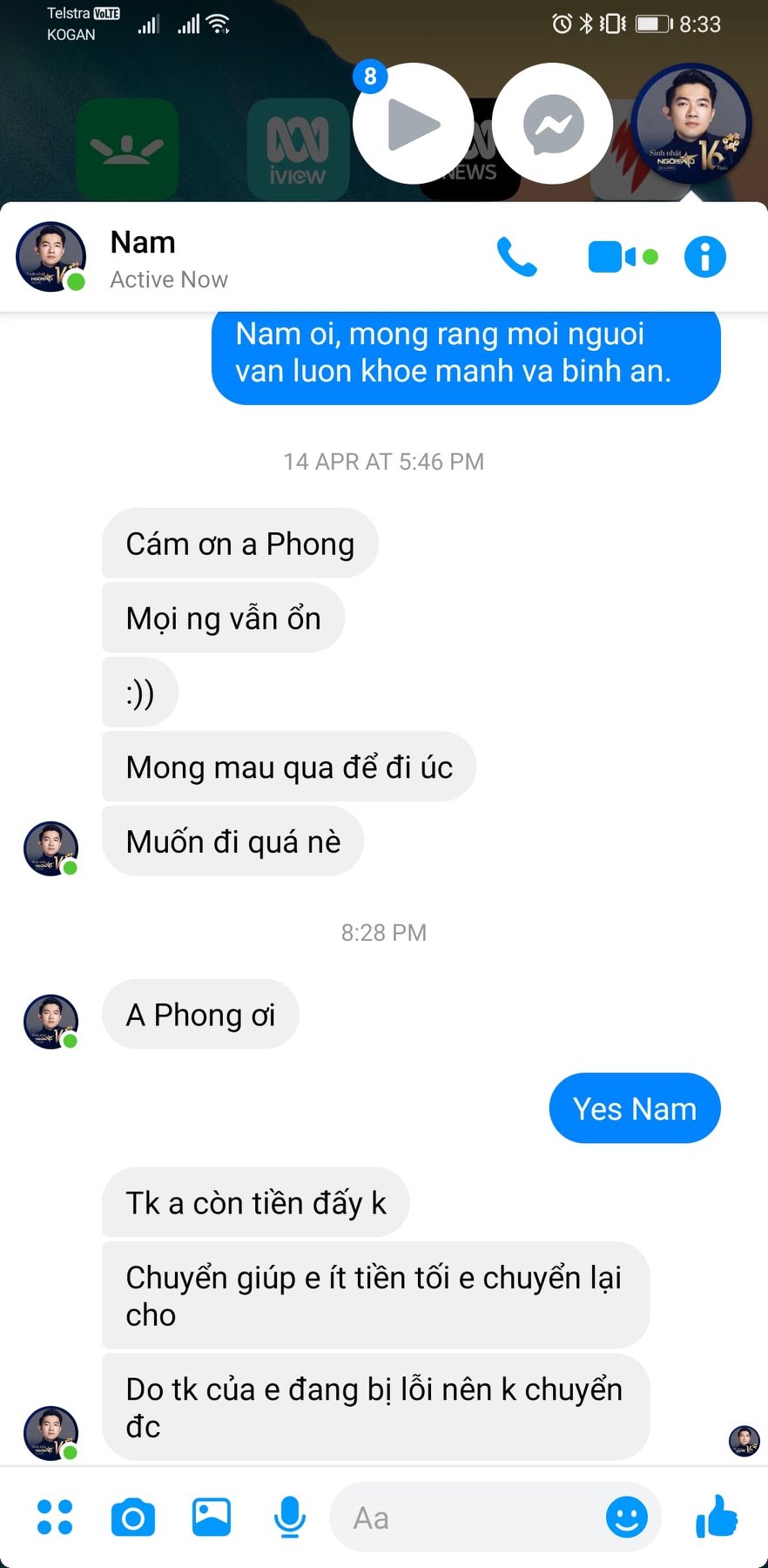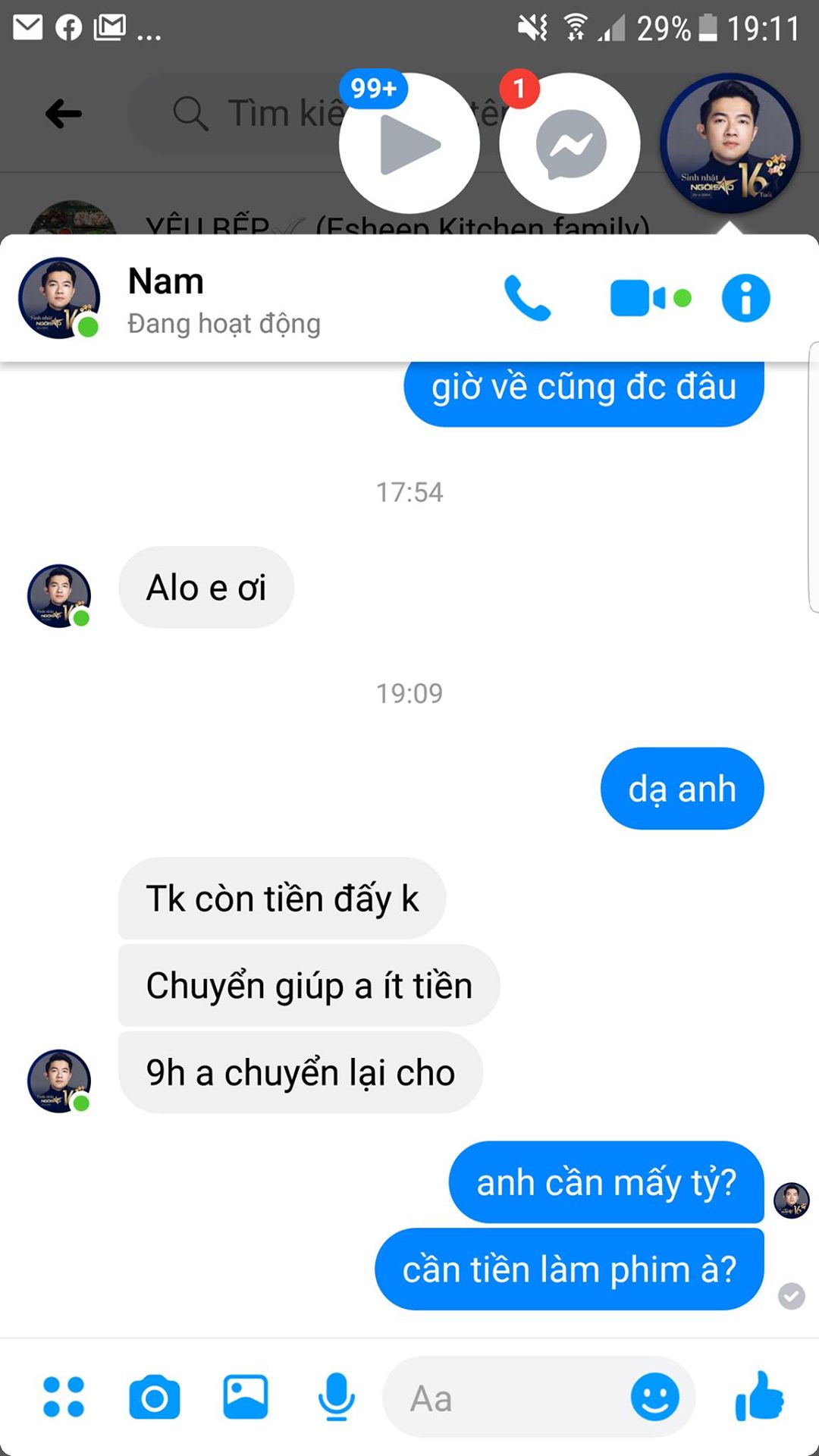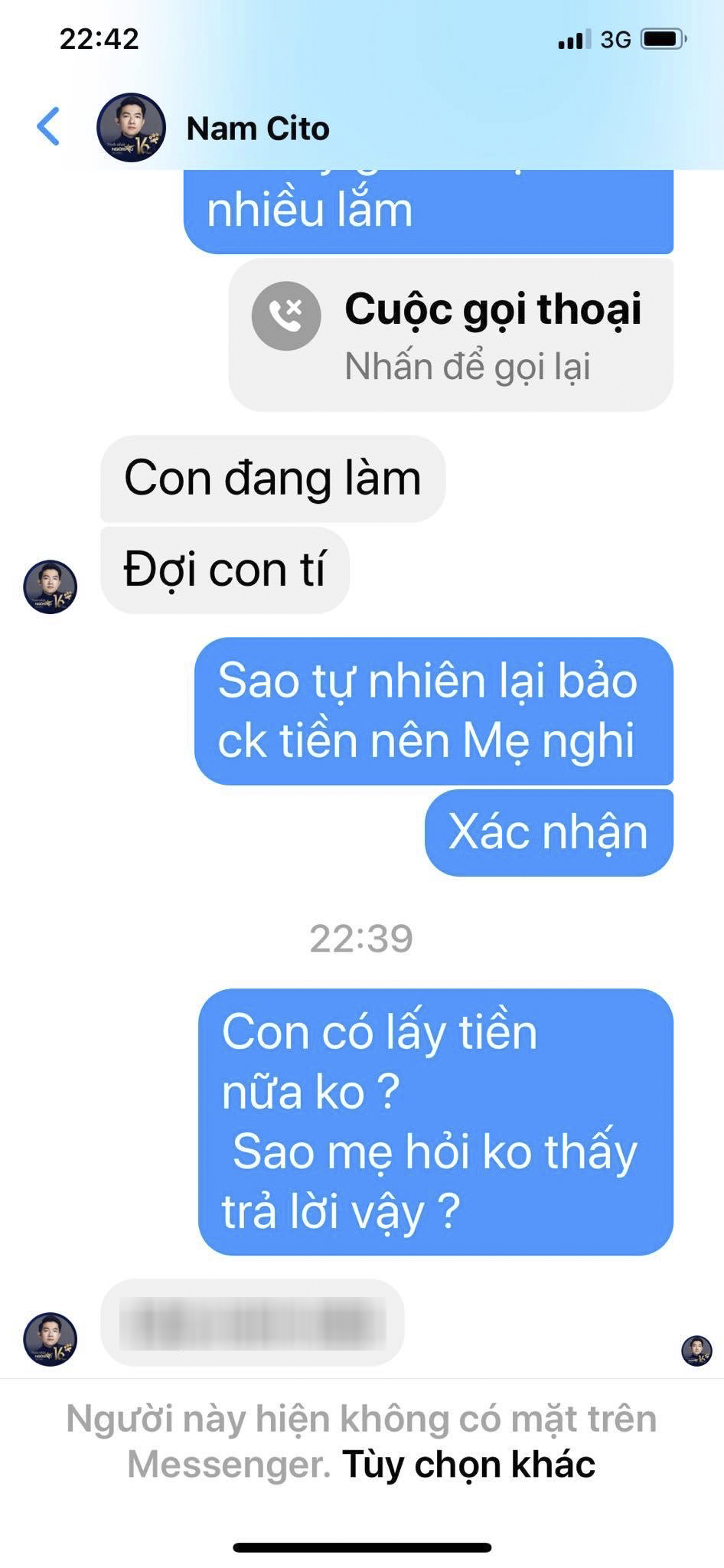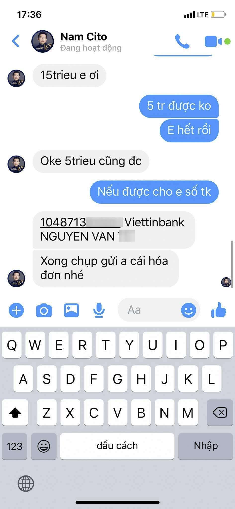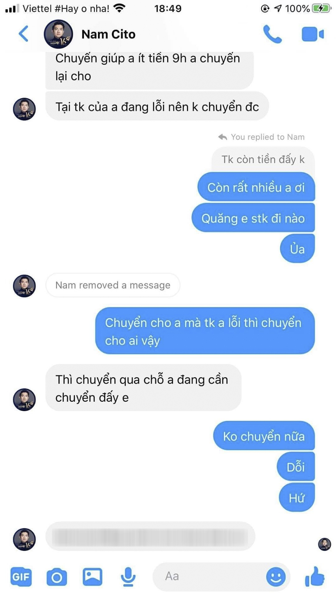 Một số hình ảnh cho thấy kẻ hack nick Facebook đạo diễn Namcito đã tìm cách lừa tiền những người khác trong danh sách bạn bè, người thân của nam đạo diễn. (Ảnh: Trần Nguyễn Bảo Nhân)