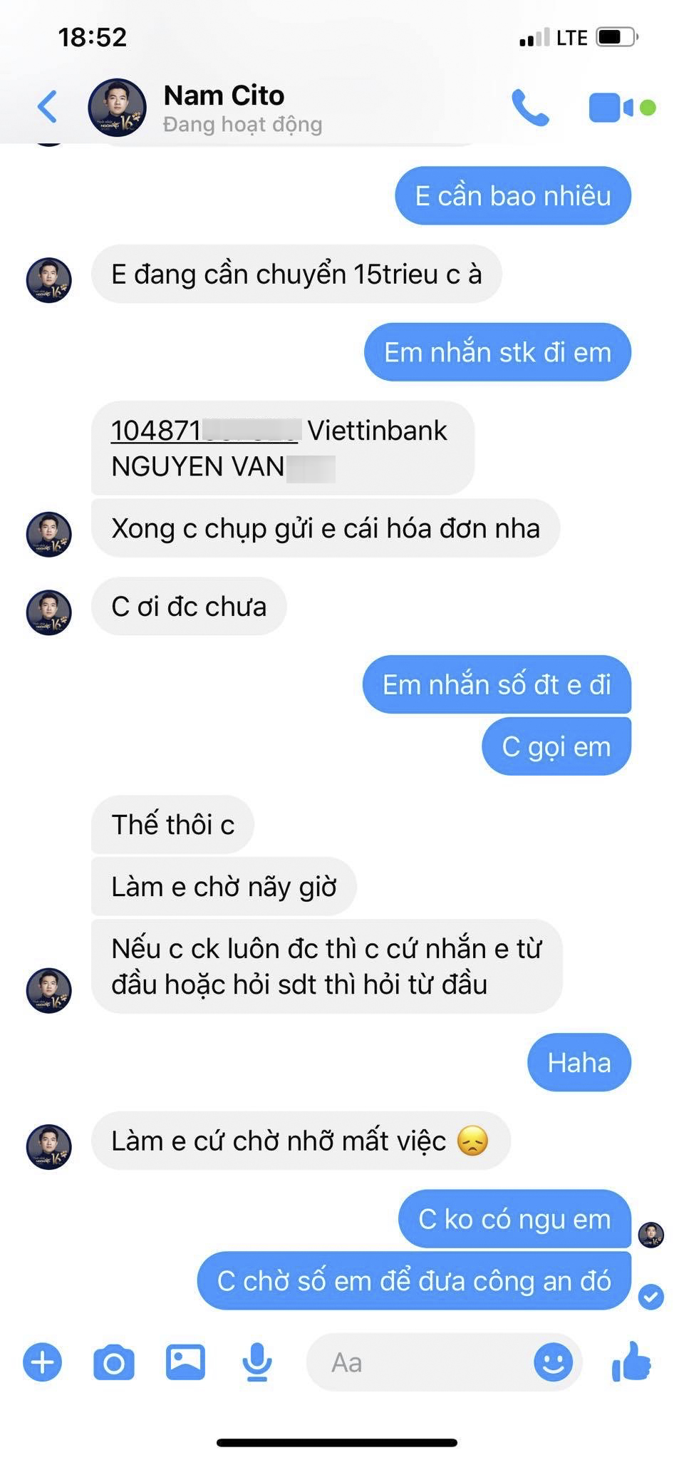 Ngay sau đó kẻ lừa đảo bắt đầu chat với những người trong inbox chat đã từng chat với Namcito, để nhờ chuyển khoản tiền qua các tài khoản ngân hàng với số tiền từ 15-30 triệu. Một số người bạn của Namcito cũng đã bị lừa và chuyển tiền cho kẻ lừa đảo xong mới nhận ra mình bị lừa thì đã quá muộn. Số tiền kẻ lừa đảo mạo danh Namcito lừa tiền trong danh sách bạn bè lên tới gần 100 triệu đồng. Có người đã báo công nhưng không chắc được giải quyết gì không.”