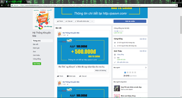 Để phát tán được tin tức về thông tin nạp thẻ, kẻ lập ra trang web đã lập rất nhiều page trên Facebook và chạy quảng cáo để càng nhiều người dùng biết đến và càng lừa đảo được nhiều người dùng. Nếu các bạn không cần thận xem xét page mà chỉ click vào tin quảng cáo sẽ được dẫn ngay đến trang lừa đảo. Vì VNPAY là công ty hàng đầu cung cấp về giải pháp thanh toán trực tuyến, người dùng bất cẩn sẽ tin tưởng ngay trang lừa đảo.